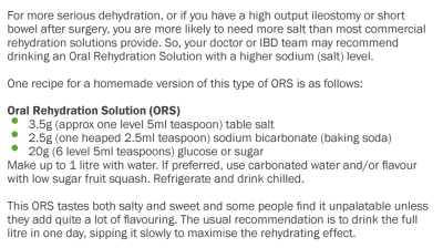 A recipe I swear by is below, but PLEASE NOTE that this one is specifically for people with a short bowel, so those that have undergone a resection. I always have this made up and waiting in the fridge if I am going out and wil be consuming alcohol and on hot days during the summer.